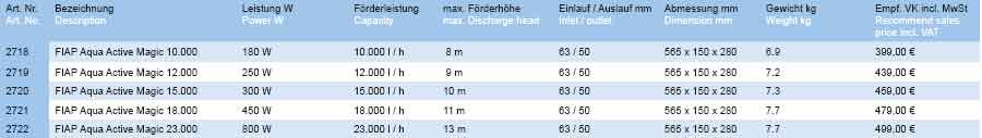 Die selbstansaugenden FIAP Aqua Active Magic Pumpen sind speziell für alle Garten- und Schwimmteiche einsetzbar. Durch einen integrierten Schmutzkorb werden Schmutzpartikel bis 4 mm vorgefiltert. Diese Pumpen sind für den Dauerbetrieb konzipiert. Die FIAP Aqua Active Magic Pumpen entsprechen der allgemeinen Norm DIN, VDE 0100, T702 und T737 zum Einsatz an Bade- und Schwimmteichen.