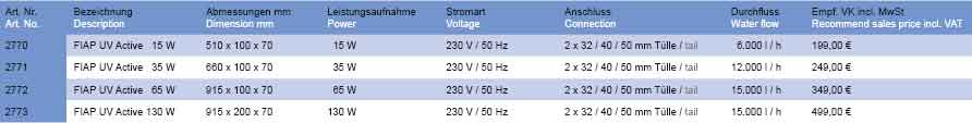 • Neue innovative Technologie • T 5 Leuchtmittel für maximale UV Dosierung (30 % mehr Leistung als PL Leuchtmittel) • Strapazierfähiges und UV beständiges PVC • Optische Funktionskontrolle • Interne Spiraldüse erhöht die UV Wirkung • Geringer Stromverbrauch, hohe Effizienz • Klares Teichwasser • Für Süss- und Salzwasser geeignet • Elektronisches Vorschaltgerät • Jede FIAP UV Active ist beliebig erweiterbar • 3 Jahre Garantie