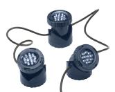 • Power LED 5 Watt • Kabellänge 10 m als Zuleitung, zwischen den Leuchten je 5 m • Netzgerät IP 44 • Umfangreiches Befestigungsset, einfache Montage • Einsetzbar über und unter Wasser bis Tauchtiefe 1,50 m • Inkl. 4 verschiedenen Farbscheiben (rot, blau, gelb, grün) • Inkl. integriertem Dämmerungsmodul